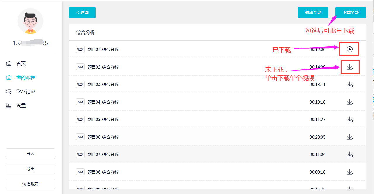 (2)點擊學習進入視頻課列表,下載視頻后可在APP內(nèi)觀看,點擊“下載全部”支持批量課件下載。
