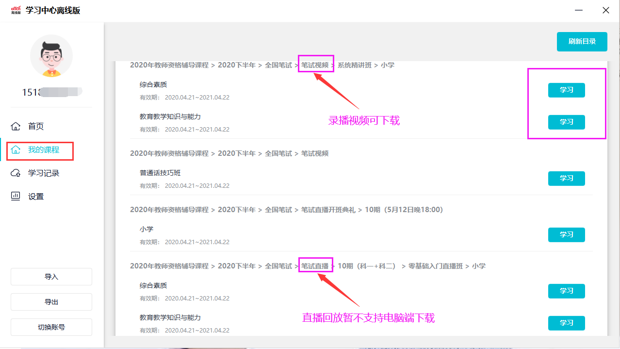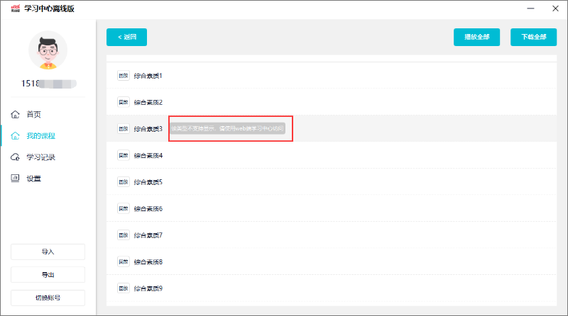 (4)離線播放器暫不支持觀看直播課、回放視頻等操作,點擊課程播放時會提示該類型不支持顯示,請使用瀏覽器在線觀看。