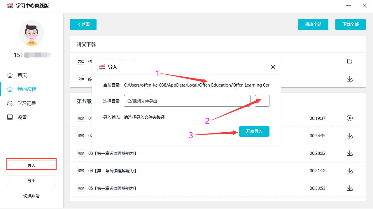 (4)導入:可通過之前下載保存的視頻文件(注:電腦上離線客戶端下載的視頻課件)導入到另一臺電腦上(需安裝離線客戶端);