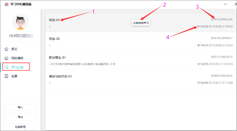 點擊界面左側(cè)學習記錄標簽頁,打開學習記錄界面,點擊該條記錄可打開視頻播放界面,并按照上次觀看進度繼續(xù)播放該視頻。