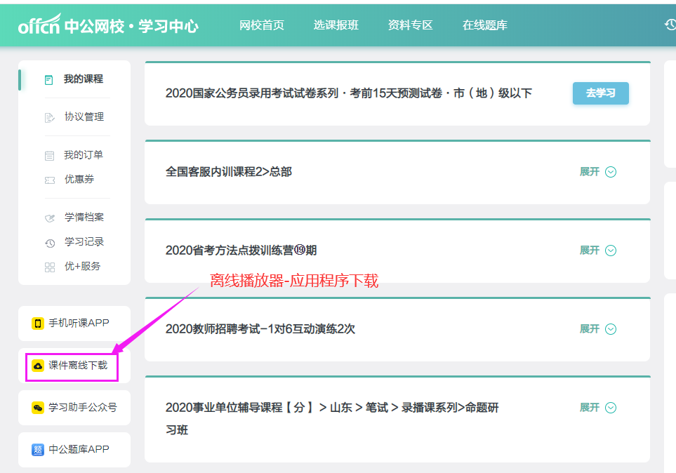 方法二:電腦登錄中公網(wǎng)校學習中心(http://xue.eoffcn.com/web/),點擊左側(cè)的“課件離線下載”,進行下載安裝。