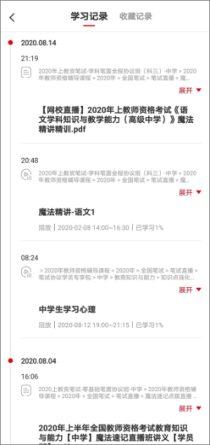 ? 查詢聽課記錄:【學習】模塊上方顯示最近一次聽課記錄,單擊“學習記錄”可查看歷史聽課記錄;
