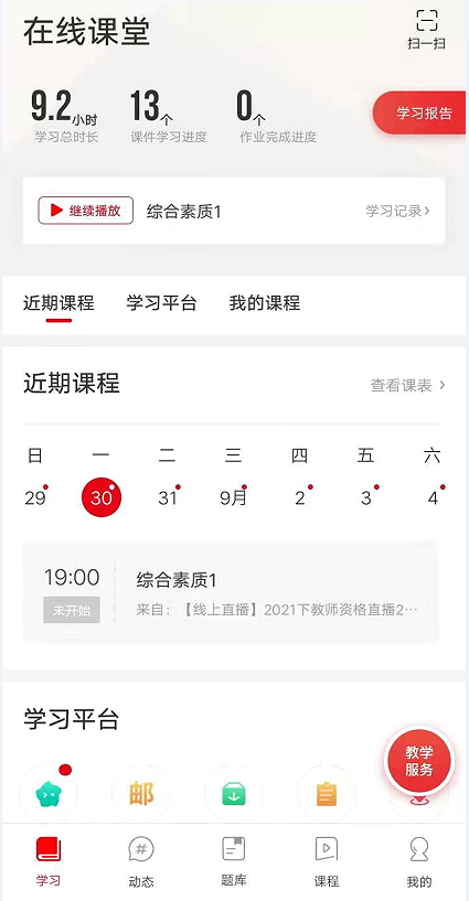 ? 近期課程安排:顯示本周直播安排(小紅點標記表示有課程安排),單擊“直播課表”可查看課表;