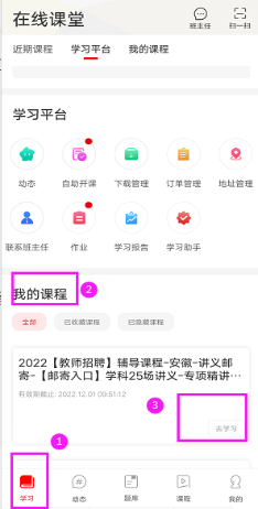 3查詢課程目錄:進入【學習】模塊,下滑頁面至“我的課程”展示已開通課程,點擊對應課程“去學習”,可查看該課程目錄,展開目錄可查看講義或視頻進行學習。