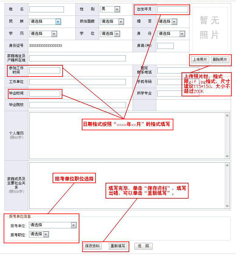 4、單擊確定后,進入個人信息維護頁面,考生直接輸入自己的信息并選擇報考單位和職位,如下圖: