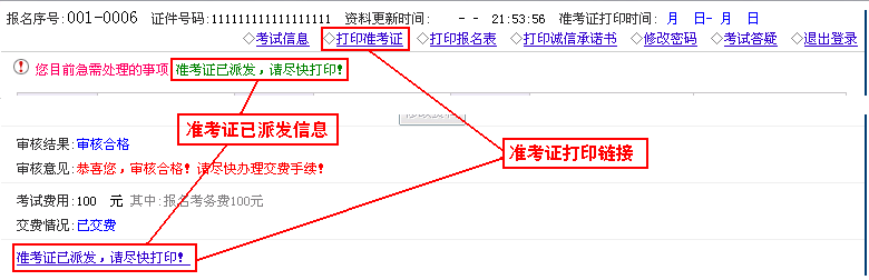 7、準考證派發(fā)后,顯示如下信息,此時打印準考證,等待考試。