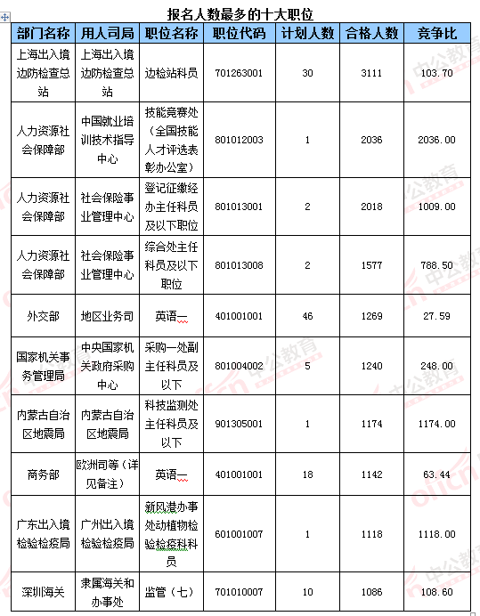 “人力資源社會(huì)部中國就業(yè)培訓(xùn)技術(shù)指導(dǎo)中心”職位競(jìng)爭(zhēng)比2000:1,是第二名“內(nèi)蒙古自治區(qū)地震局”職位的兩倍。隨著報(bào)名截止時(shí)間的臨近,該職位會(huì)成為本年度國考熱度職位無疑!