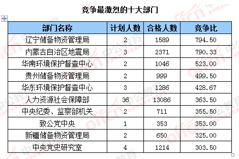 競爭最激烈的兩個部門——遼寧儲備物資管理局與內(nèi)蒙古自治區(qū)地震局“并駕齊驅(qū)”,競爭比分別達到794.5:1和790.3:1。
