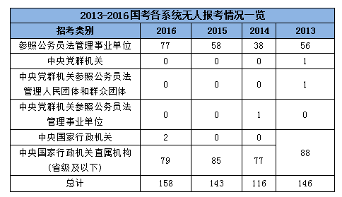 本次國(guó)考共158個(gè)職位無(wú)人通過(guò)審核,僅有2個(gè)職位來(lái)自中央國(guó)家行政機(jī)關(guān)本部,其余全部為參照公務(wù)員管理法管理事業(yè)單位和中央國(guó)家行政機(jī)關(guān)省級(jí)以下直屬機(jī)構(gòu),同時(shí),地市以下職位共有個(gè),從近四年的無(wú)人報(bào)考數(shù)據(jù)來(lái)看,基本情況和今年一樣。