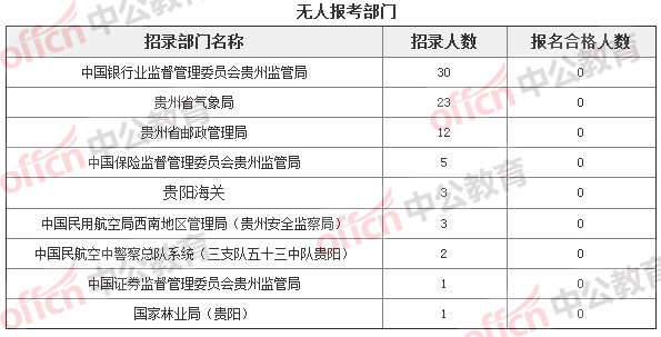 截至15日16時(shí),貴州招錄部門中仍有六大部門的職位無人報(bào)考,具體如下: