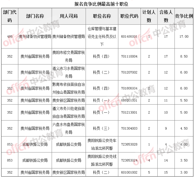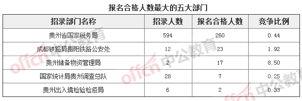 報(bào)名通過審核人數(shù)較多的職位主要集中在貴州省國家稅務(wù)局、成都鐵路局貴陽鐵路公安處、貴州儲(chǔ)備物資管理局等部門,具體信息如下: