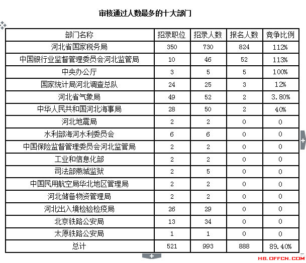 截止到15日16時,通過審核人數(shù)前三位的部門依次是:河北省國家稅務(wù)局、中國銀行業(yè)監(jiān)督管理委員會河北監(jiān)管局、中央辦公廳,三部門通過審核總?cè)藬?shù)達881人,占通過審核總?cè)藬?shù)的99.2%。