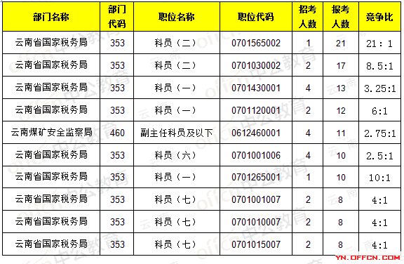 報(bào)名通過審核人數(shù)前十的職位主要集中在云南省國家稅務(wù)局、云南煤礦安全監(jiān)察局,具體信息如下: