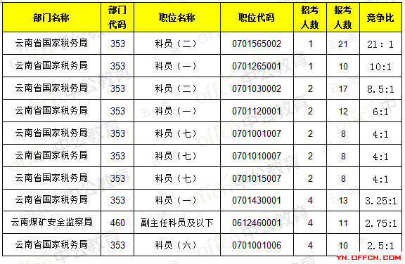 截止15日17時(shí),招錄比例的職位為云南省國家稅務(wù)局,職位代碼是0701565002,招錄1人,通過人數(shù)21人,競(jìng)爭比21:1 。