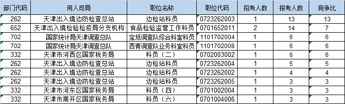 報(bào)名通過審核人數(shù)前十的職位主要集中在天津出入境檢驗(yàn)檢疫局分支機(jī)構(gòu)、天津出入境邊防檢查總站、國家統(tǒng)計(jì)局天津調(diào)查總隊(duì),具體信息如下: