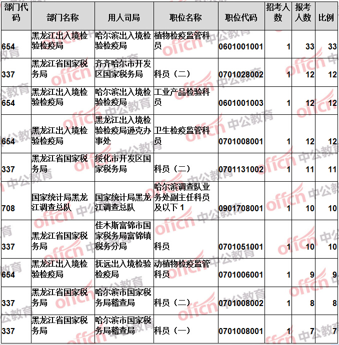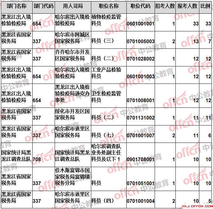 報(bào)名通過審核人數(shù)前十的職位主要集中在黑龍江出入境檢驗(yàn)檢疫局、黑龍江省國家稅務(wù)局、國家統(tǒng)計(jì)局黑龍江調(diào)查總隊(duì)等部門,具體信息如下: