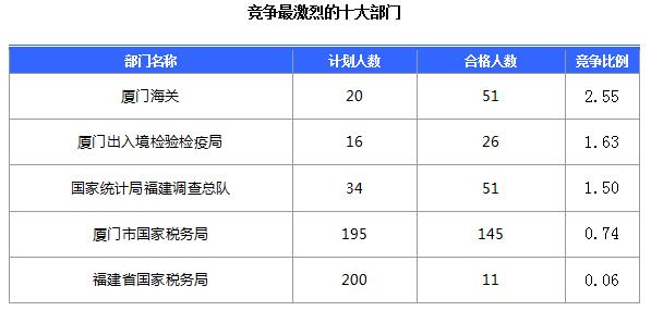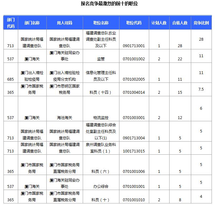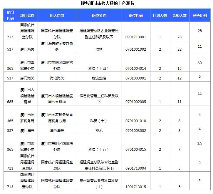 報名通過審核人數(shù)前十的職位主要集中在國家統(tǒng)計局福建調(diào)查總隊、廈門海關(guān)駐同安辦事處、廈門市思明區(qū)國家稅務(wù)局等部門,具體信息如下: