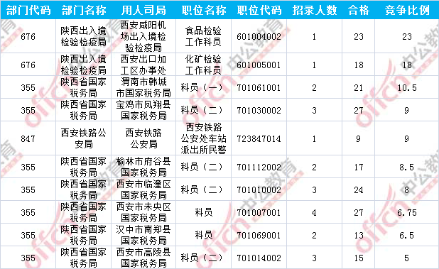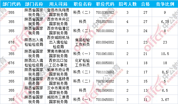 報名通過審核人數(shù)前十的職位主要集中在陜西省國家稅務局以及陜西出入境檢驗檢疫局這兩個部門,具體信息如下: