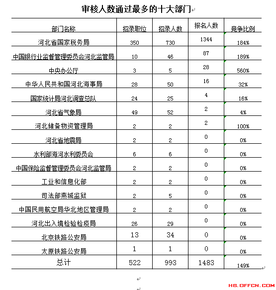 截止到16日8時,通過審核人數前三位的部門依次是:河北省國家稅務局、中國銀行業(yè)監(jiān)督管理委員會河北監(jiān)管局、中央辦公廳,三部門通過審核總人數達1459人,占通過審核總人數的98.3%。