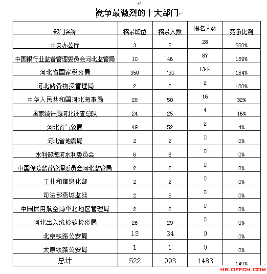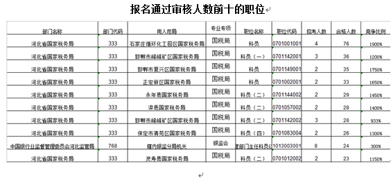 報名通過審核人數(shù)前十的職位主要集中在河北省國家稅務(wù)局、中國銀行業(yè)監(jiān)督管理委員會河北監(jiān)管局、中央辦公廳等部門,具體信息如下: