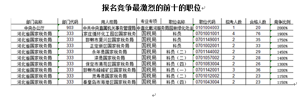 截止到16日8時,競爭比例的職位為中央辦公廳中直北戴河服務(wù)局園林綠化處主任科員,招錄1人,截止到16日8時通過人數(shù)為20人,競爭比例2000%,再創(chuàng)河北市競爭比例新高!