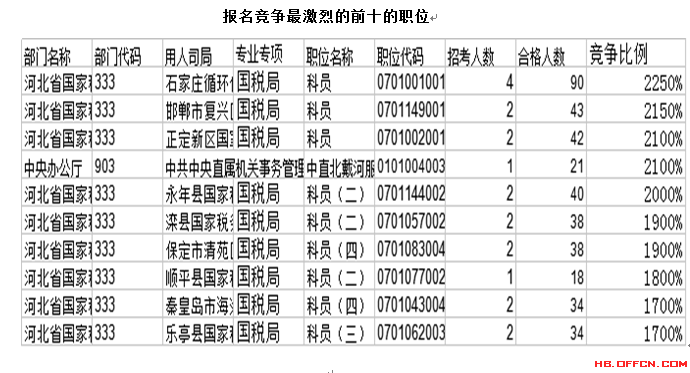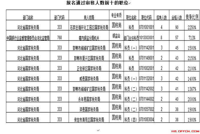 報名通過審核人數(shù)前十的職位主要集中在河北省國家稅務(wù)局、中國銀行業(yè)監(jiān)督管理委員會河北監(jiān)管局、中央辦公廳等部門,具體信息如下: