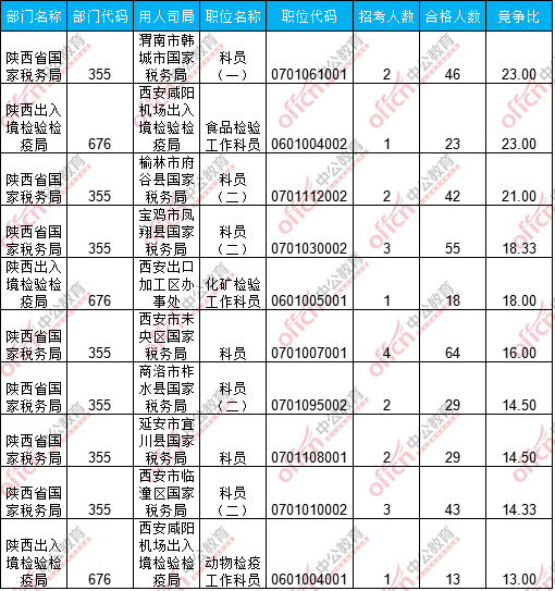 報(bào)名通過審核人數(shù)前十的職位主要集中在陜西省國家稅務(wù)局以及陜西出入境檢驗(yàn)檢疫局這兩個(gè)部門,具體信息如下: