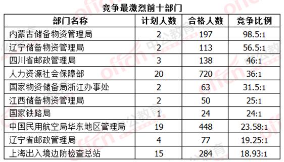 內蒙古儲備物資管理局取代遼寧儲備物資管理局,躍居為競爭最激烈前十部門榜單首位,僅招錄2人,已經(jīng)197人通過審核,競爭比高達98.5:1, 遼寧儲備物資管理與局四川省郵政管理局也有上升趨勢,未來到底誰主沉浮,請考生們繼續(xù)關注中公網(wǎng)校每日國考報名數(shù)據(jù)分析。