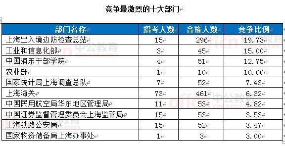 為幫助廣大考生更清晰的了解今日報名情況,上海中公網(wǎng)校整理了審核通過人數(shù)前十位的部門以及競爭比例最激烈的十大部門,供廣大考生參考:
