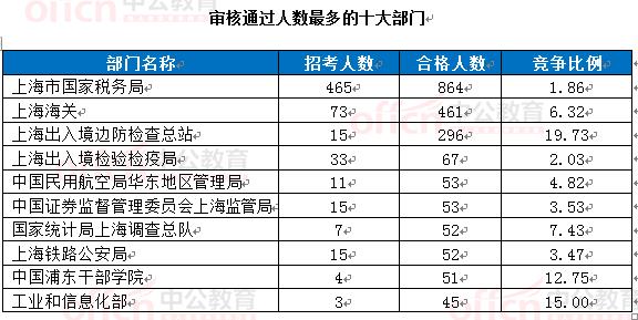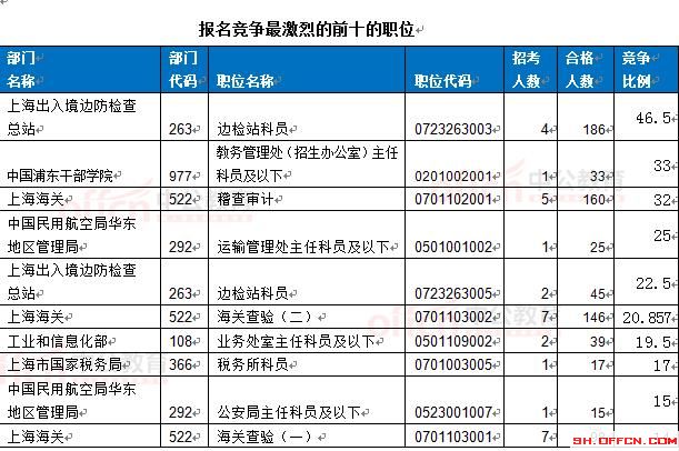 報名通過審核人數(shù)前十的職位主要集中在上海出入境邊防檢查總站、上海海關(guān)、工業(yè)和信息化部等部門,具體信息如下: