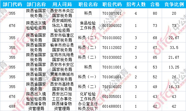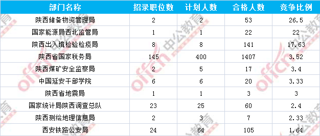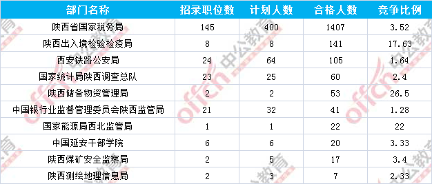 報名通過審核人數(shù)前十的職位主要集中在陜西省國家稅務(wù)局、陜西出入境檢驗檢疫局、陜西儲備物資管理局等部門,具體信息如下: