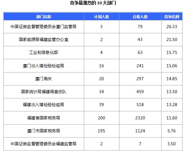 為幫助廣大考生更清晰的了解今日?qǐng)?bào)名情況,福建中公教育整理了審核通過(guò)人數(shù)前10位的部門(mén)以及競(jìng)爭(zhēng)比例最激烈的10大部門(mén),供廣大考生參考: