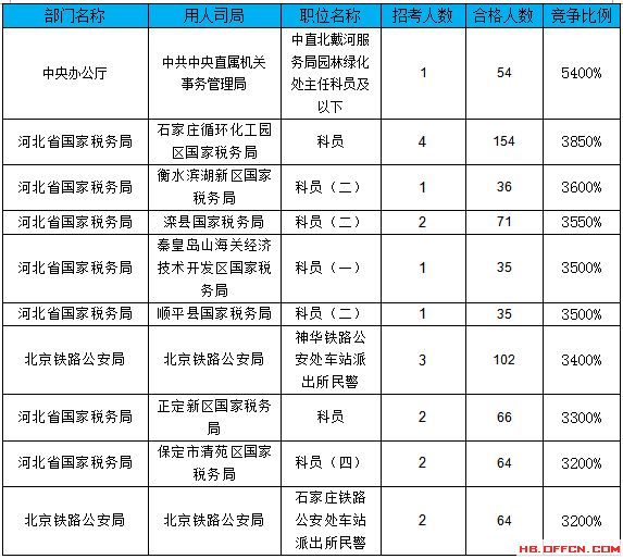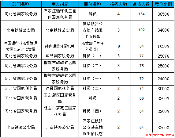 報(bào)名通過(guò)審核人數(shù)前十的職位主要集中在河北省國(guó)家稅務(wù)局、中國(guó)銀行業(yè)監(jiān)督管理委員會(huì)河北監(jiān)管局、北京鐵路公安局等部門,具體信息如下: