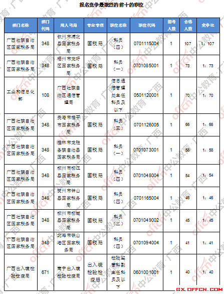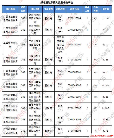 報(bào)名通過(guò)審核人數(shù)前十的職位主要集中在廣西壯族自治區(qū)國(guó)家稅務(wù)局、工業(yè)和信息化部等部門(mén),具體信息如下:
