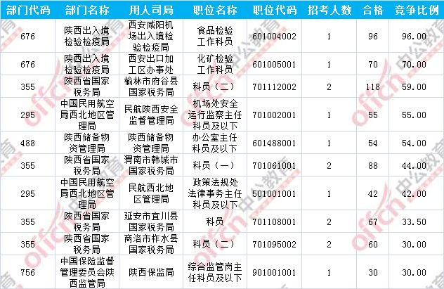截止到17日16時(shí),競(jìng)爭(zhēng)比例的職位為陜西出入境檢驗(yàn)檢疫局西安咸陽(yáng)機(jī)場(chǎng)出入境檢驗(yàn)檢疫局食品檢驗(yàn)工作科員一職,招錄1人,截止到17日16時(shí)通過(guò)人數(shù)為96人。中公
