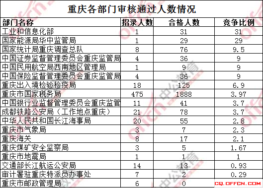 截止到15日16時,競爭比例的職位為‘重慶機場出入境檢驗檢疫局’一職,招錄1人,截止到17日16時通過人數(shù)為46人。但是還有很多崗位沒有人去報名。