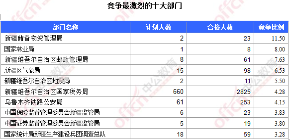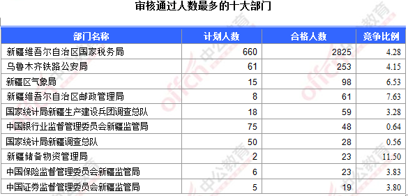 為幫助廣大考生更清晰的了解今日報名情況,新疆中公網(wǎng)校整理了審核通過人數(shù)前十位的部門以及競爭比例最激烈的十大部門,供廣大考生參考: