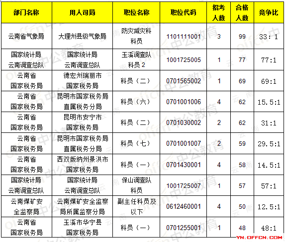 報(bào)名通過(guò)審核人數(shù)前十的職位主要集中在云南省氣象局、國(guó)家統(tǒng)計(jì)局云南調(diào)查總隊(duì)、云南省國(guó)家稅務(wù)局等部門,具體信息如下: