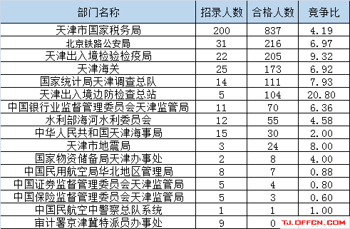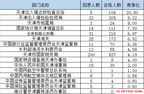 為幫助廣大考生更清晰的了解今日?qǐng)?bào)名情況,天津中公網(wǎng)校整理了審核通過(guò)人數(shù)前五位的部門以及競(jìng)爭(zhēng)比例最激烈的五大部門,供廣大考生參考: