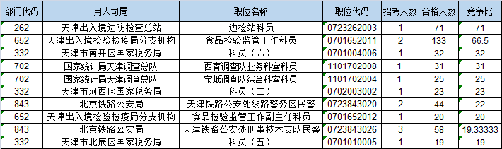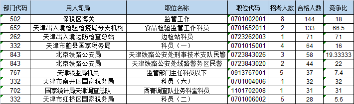 報(bào)名通過(guò)審核人數(shù)前十的職位主要集中在保稅區(qū)海關(guān)、天津出入境檢驗(yàn)檢疫局分支機(jī)構(gòu)、天津出入境邊防檢查總站,具體信息如下: