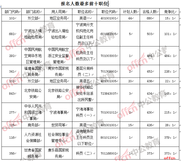 從報(bào)名人數(shù)上來看,截止至18日8時(shí),報(bào)名人數(shù)超過400的崗位有8個(gè)。外交部地區(qū)業(yè)務(wù)司(職位代碼401001001)一職,從昨日躍居至“人氣”后,人氣依舊不減,報(bào)名人數(shù)比17日下午相比,增加84人,引來了680人的“競(jìng)相追逐”,與去年同期報(bào)名人數(shù)最多的888人相比,可以看出,今年的報(bào)考者非常理性,錯(cuò)開了“擁堵”崗位,增加了成“公”幾率。寧波出入境檢驗(yàn)檢疫局(職位代碼601682005)一職,比昨日下午的426人,增加77人報(bào)考。中國(guó)民用航空局華東地區(qū)管理局中國(guó)民用航空浙江安全監(jiān)督管理局機(jī)場(chǎng)處主任科員及以下(職位代碼701003003)一職,因比昨日下午增加105人報(bào)考,而上升了2個(gè)名次,位居第三位。