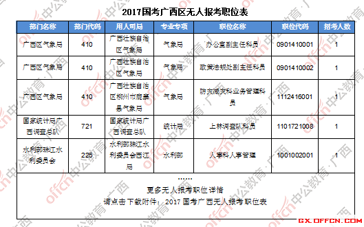 截止到18日8時,工作地點在廣西的職位共有128個無人報考,占全部職位的19.9%。下面是部分廣西無人報考職位一覽表,更多無人報考職位詳情請下載附件,廣西中公網(wǎng)校專家建議廣大考生結(jié)合自身條件,根據(jù)自己的實際情況找到屬于自己的職位,避免激烈競爭。