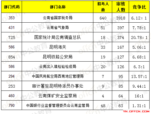 為幫助廣大考生更清晰地了解今日?qǐng)?bào)名情況,云南中公網(wǎng)校整理了審核通過(guò)人數(shù)部門(mén)排名,供廣大考生參考: