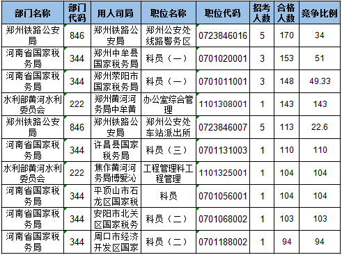 報(bào)名通過(guò)審核人數(shù)排名前列的職位主要集中在鄭州鐵路公安局、河南省國(guó)家稅務(wù)局,水利部黃河水利委員會(huì),具體信息如下: