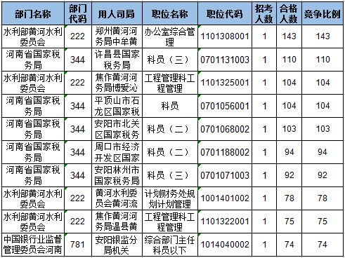 截止18日8時(shí),招錄比例的職位為鄭州黃河河務(wù)局中牟黃河河務(wù)局辦公室綜合管理一職,招錄1人,截止18日8時(shí)通過(guò)人數(shù)為143人。