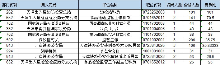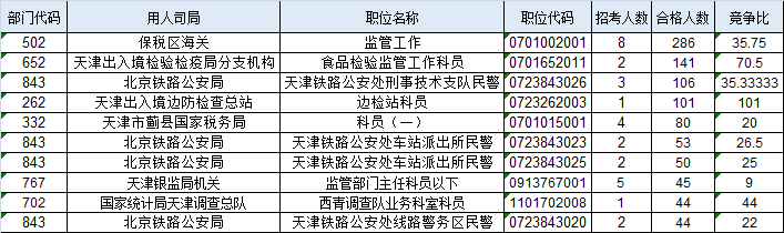 報名通過審核人數(shù)前十的職位主要集中在保稅區(qū)海關、天津出入境檢驗檢疫局分支機構、北京鐵路公安局,具體信息如下: