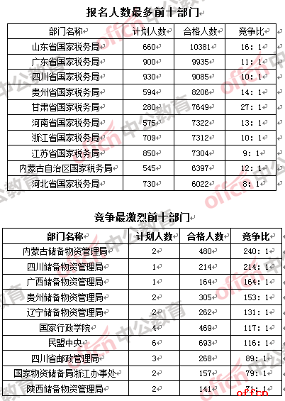 從部門競(jìng)爭(zhēng)比上來(lái)看,有7個(gè)部門的競(jìng)爭(zhēng)比過(guò)百,2個(gè)部門的競(jìng)爭(zhēng)比超過(guò)200:1,與上午相比,物管局 “霸占”了7個(gè)名額,內(nèi)蒙古物管局穩(wěn)坐“頭把交椅”,與昨日同期相比,競(jìng)爭(zhēng)前十的部門增加了“新鮮的血液”,四川物管局與廣西物管局成為競(jìng)爭(zhēng)“黑馬”,躍居競(jìng)爭(zhēng)最烈部門的第二與第三的位置。國(guó)家行政學(xué)院,民盟中央、陜西儲(chǔ)備物資管理局等部門在今日“擠進(jìn)”榜單。