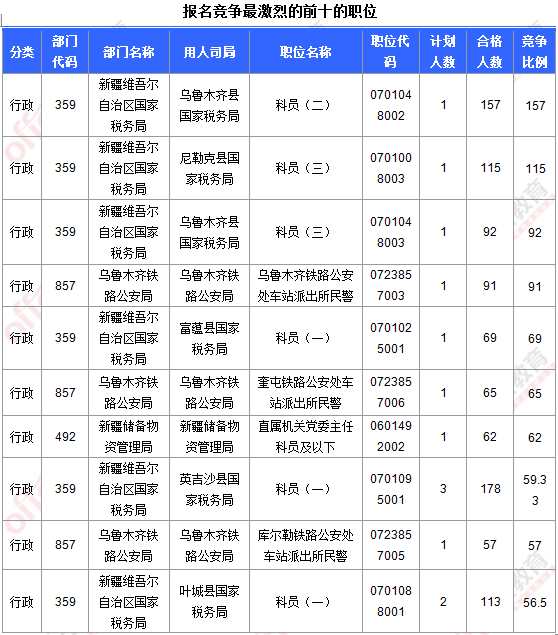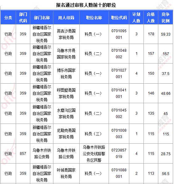 報名通過審核人數(shù)前十的職位主要集中在新疆維吾爾自治區(qū)國家稅務(wù)局、烏魯木齊鐵路公安局部門,具體信息如下: