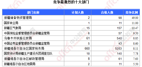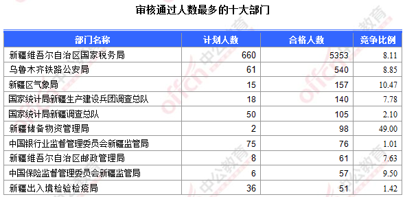 為幫助廣大考生更清晰的了解今日報名情況,新疆中公教育整理了審核通過人數(shù)前十位的部門以及競爭比例最激烈的十大部門,供廣大考生參考: