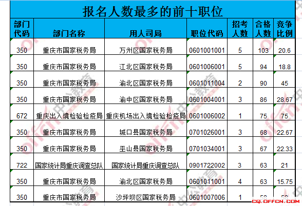 截止到18日16時(shí),競(jìng)爭(zhēng)比例的職位為‘重慶機(jī)場(chǎng)出入境檢驗(yàn)檢疫局’一職,招錄1人,截止到18日8時(shí)通過人數(shù)為75人。但是還有少數(shù)崗位沒有人去報(bào)名。